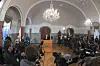 Berit Reiss-Andersen, leder av Nobelkomiteen, offentliggjør her fjorårets fredprisvinner. Til høyre står Olav Njølstad, direktør ved Nobelinstituttet. Foto: Terje Pedersen / NTB scanpix
