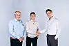 Ansvarlig redaktør i Finnmark, Arne Reginiussen (t.h.), ønsker Kronstadposten velkommen til Amedia. Tom Erik Nilsen (i midten) fortsetter som aksjonær og redaktør. Håkon Nilsen har solgt sine aksjer i avisa.