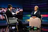 Høyres leder Erna Solberg og programleder Fredrik Solvang under Debatten på NRK torsdag kveld.