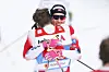 Johannes Høsflot Klæbo og Emil Iversen gratulerer hverandre etter seieren i lagsprint i ski-VM. Over én million TV-seere fikk med seg bragden på NRK. Foto: Fredrik Hagen / NTB scanpix