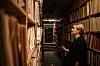 Research-senteret. Lageret inneholder også en stor samling med aviser fra krigen. Innerst i det gamle biblioteket finner Katrine Smedbråten Andresen en samling med avisa «Fritt Folk». Nasjonal Samlings egen avis fra andre verdenskrig.Foto: Marte Vike Arnesen