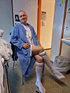 Etter den store operasjonen i mai, hvor det ble tatt ut 28 lymfeknuter fra mageregionen, tok det noen dager før Jostein Larsen Østring klarte å gå igjen. Her to dager etter operasjonen.Foto: Privat