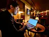 ettertenksomt, der han sitter med laptopen på fanget på en kafé i Stockholm