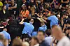 Ifølge VG ble det jobbet febrilsk med å redde journalisten inne i hallen med 20.000 tilskuere. Kampen fortsatte etter at personen ble bragt ut av arenaen.