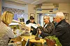 Petter Kaasen, Per Arne Rønning, Torstein Hofstad-Fjellet og sjåfør Michael Rølvåg pakker og setter på adresselapper til dagens aviser. I løpet av få minutter er bunkene stablet i bilder som frakter dagens nyheter ut til innbyggerne i øysamfunnet.