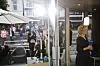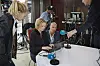 Programleder Sigrid Sollund tester lyset like før sending, mens gjestene samler seg utenfor. Reporter Sigrud Flæten (i midten i bakgrunnen) snakker med noen av dem. Kollega Sophie Lorch-Falch skimtes på land i bakgrunn. Alle foto: Andrea Gjestvang