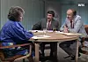 NRK-journalistene Bjørn Hansen og Ole Kristen Harborg intervjuer Gro Harlem Brundtland i Valgrevyen i 1985.