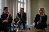 Årets mottakere av Free Media Awards møtte tirsdag til en panelsamtale hos Fritt Ord i Oslo. F.v.: Natalija Gumenjuk, Jevhen Maloletka og Katerina Sergatskova.Foto: Anna Stjern