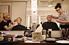I løpet av få minutter strømmer det på med rådgivere og partiledere som tar turen for å bli sminket. Lokalet fylles av romslig humor og god stemning, men med mye spenning under overflaten.