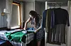 Organisasjonssekretær Ingunn Emdal stryker den grønne kjolen som Une skal ha på seg under debatten. Se større bilde her.