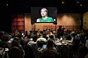 Journalister og kommentatorer følger med og gir sin dom. Debatten overføres direkte på storskjerm og øl selges i baren. Se større bilde her.