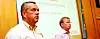 Øyvind Næss, personal- og informasjonsdirektør i VG og sjefredaktør Bernt Olufsen under et allmøte om nedbemanning i 2006. Foto: Birgit Dannenberg