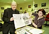 Sjefredaktør Iver Hammeren og klubbleder Wigdis Korsvik illustrerer hva årets kutt i pressestøtten betyr for Nordlandsposten: en halv side av en 40 siders avis.